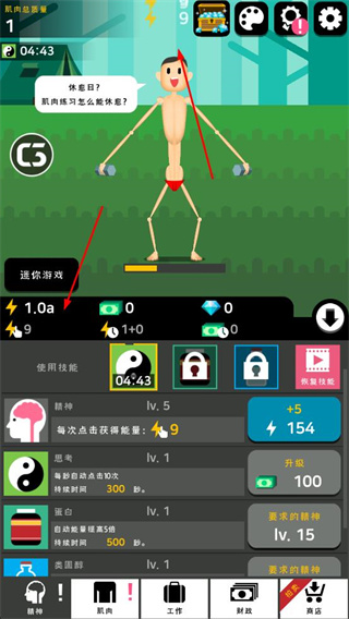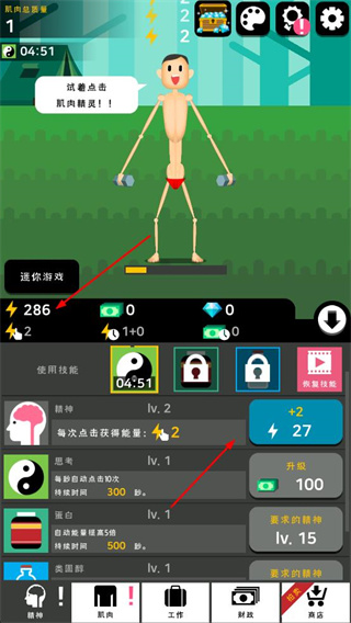 1、點擊角色肌肉區(qū)域進行鍛煉,獲取能量,這是提升肌肉和屬性的基礎(chǔ)操作。