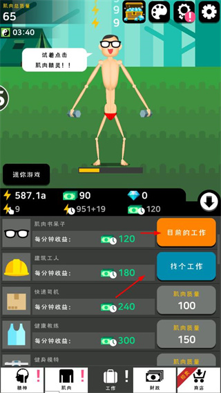 4、更換工作,獲取不同的每分鐘收益,積累資金用于升級技能、肌肉或解鎖新內(nèi)容。