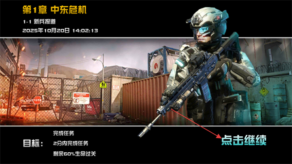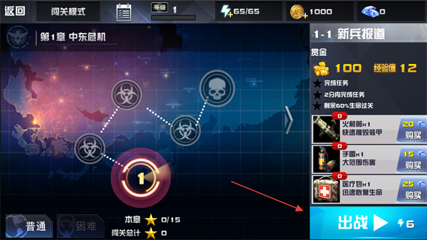 1、在關(guān)卡選擇界面,如第1章中東危機(jī)的1-1新兵報(bào)道,確認(rèn)關(guān)卡目標(biāo)和獎(jiǎng)勵(lì),點(diǎn)擊出戰(zhàn)。
