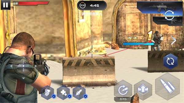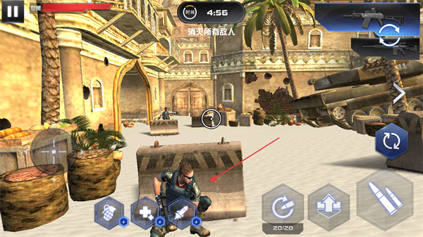 4、發(fā)現(xiàn)敵人后,通過屏幕右側(cè)射擊按鈕等攻擊敵人,配合手雷、火箭筒等道具消滅敵人,完成關(guān)卡目標(biāo)。