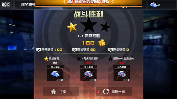 4、戰(zhàn)斗勝利后,查看獎勵如任務獎金,爆頭獎金等,點擊再玩一局可重新挑戰(zhàn)關(guān)卡。
