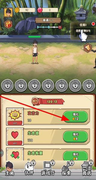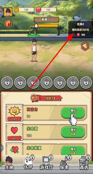 1、消耗金幣強化攻擊力,提升角色攻擊能力,助力戰(zhàn)斗,強化所需金幣數(shù)量會有提示。
