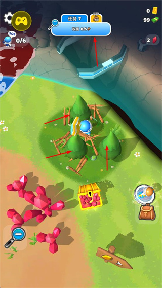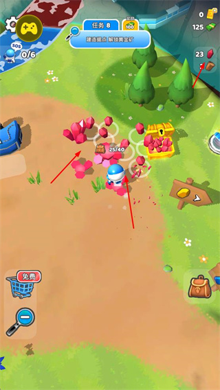 1、操控角色在星球不同區(qū)域挖掘各類資源,包括紅色晶體、木材、黃色礦石等。