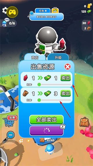 3、在出售資源界面,將收集的資源出售獲取綠色資源,綠色資源可用于升級角色或解鎖功能。