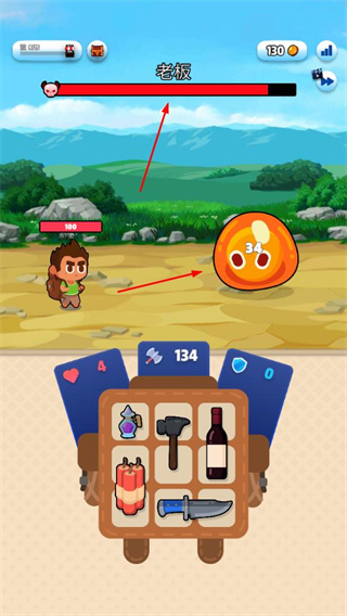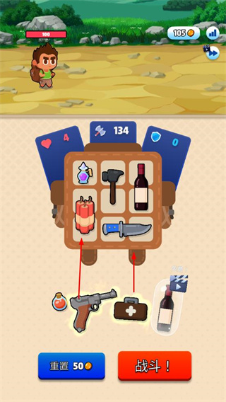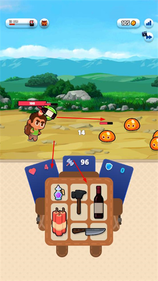 1、合成各類物品提升攻擊等屬性,點(diǎn)擊戰(zhàn)斗參與戰(zhàn)斗,利用合成物品攻擊敵人,獲取金幣獎(jiǎng)勵(lì)。