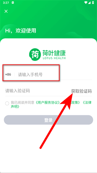 3、在登錄頁面,輸入框中填寫手機號碼,點擊獲取驗證碼。