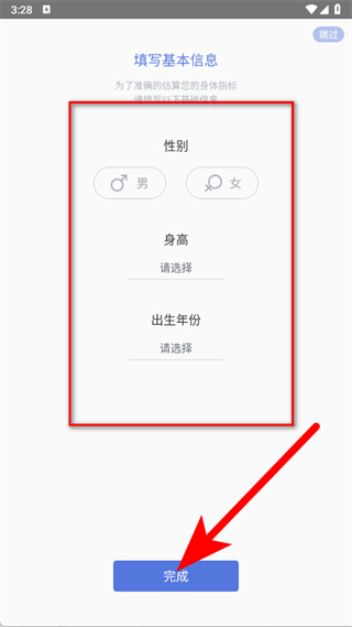 1、打開體重記錄,進(jìn)入填寫基本信息頁面,選擇性別等信息后,點擊完成按鈕。