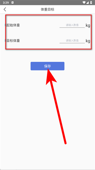 4、分別輸入起始體重和目標(biāo)體重的數(shù)值,點擊保存,完成體重目標(biāo)設(shè)置。