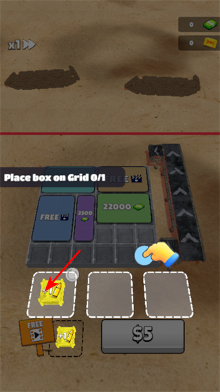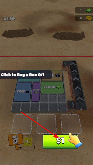 4、點擊綠色的$1按鈕購買箱子,完成“Click to Buy a Box0/1”任務,通過不斷購買和布局箱子來推進游戲進程。