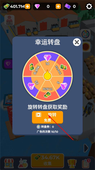 4、找到“幸運(yùn)轉(zhuǎn)盤(pán)”入口,點(diǎn)擊免費(fèi)旋轉(zhuǎn),需要看完一段廣告,轉(zhuǎn)盤(pán)停止后如果指向鉆石區(qū)域,就能直接獲得對(duì)應(yīng)數(shù)量的鉆石。