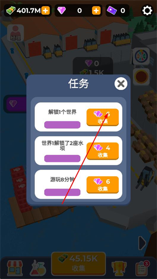2、進(jìn)入游戲的任務(wù)中心,里面有解鎖新區(qū)域、培養(yǎng)特定水壩設(shè)施等任務(wù),按要求完成后點(diǎn)擊“領(lǐng)取獎(jiǎng)勵(lì)”,就能拿到鉆石。