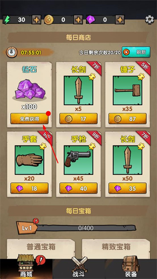 2、參與每日商店活動,免費(fèi)或消耗資源獲取鉆石、武器、道具等,豐富裝備庫。