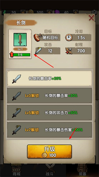 4、升級裝備,消耗金幣提升裝備屬性,增強(qiáng)戰(zhàn)斗力,持續(xù)合成、獲取資源、升級裝備,朝著抵御更多波次敵人的目標(biāo)努力。