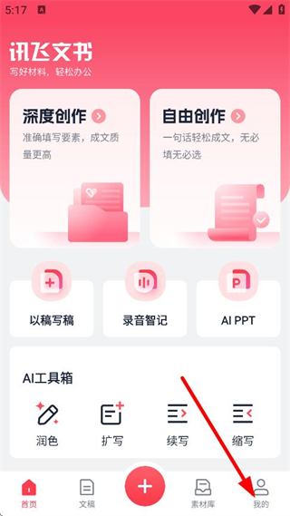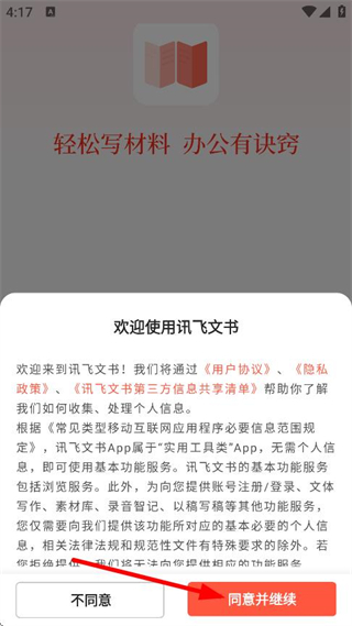 1、在歡迎使用訊飛文書彈窗中,點擊同意并繼續(xù),進入首頁。