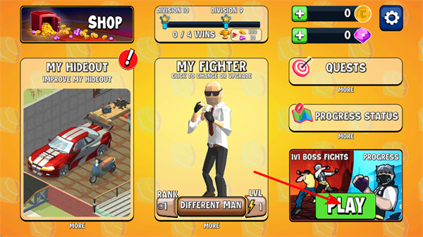 1、點(diǎn)擊綠色PLAY按鈕,可進(jìn)入1V1BOSS戰(zhàn)模式,挑戰(zhàn)強(qiáng)力對(duì)手,獲勝能提升排名獲取資源。