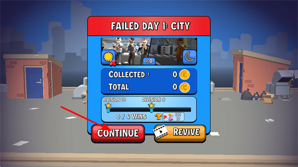 4、游戲失敗后,點(diǎn)擊紅色CONTINUE按鈕可繼續(xù)游戲,快速回到挑戰(zhàn)進(jìn)程中。