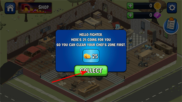 1、點擊綠色COLLECT按鈕,可領取25枚金幣獎勵,這些金幣可用于清理Chef's Zone或其他游戲內消耗。