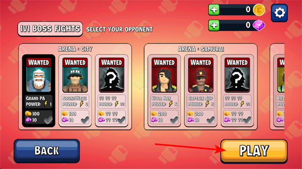 3、在1V1 BOSS戰(zhàn)選擇界面,點擊黃色PLAY按鈕,可進入對應競技場挑戰(zhàn)BOSS,獲勝后能獲取資源和提升排名。