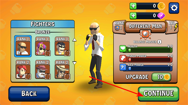 4、在角色界面,點擊綠色CONTINUE按鈕可繼續(xù)游戲進程,也可消耗金幣對角色Different Man的屬性進行升級。