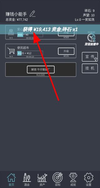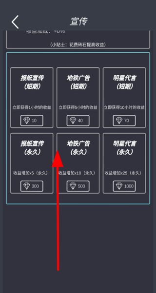 4、玩家進(jìn)行宣傳操作,花費(fèi)鉆石選擇不同的宣傳方式,能立即獲取收益或永久增加收益。