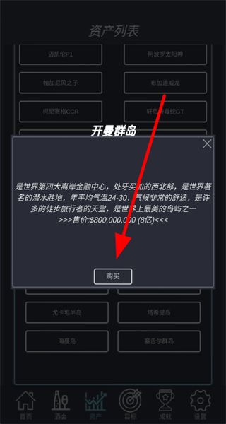 2、在資產(chǎn)列表中,可以隨意花費(fèi)資金購(gòu)買(mǎi)各類(lèi)資產(chǎn),像開(kāi)曼群島等,購(gòu)買(mǎi)后助力提升收益。