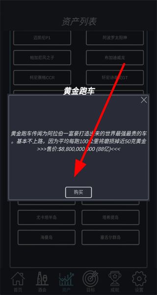 3、還能購(gòu)買(mǎi)特殊資產(chǎn),如黃金跑車(chē),這些特殊資產(chǎn)也能為賺錢(qián)帶來(lái)幫助,提升整體收益。