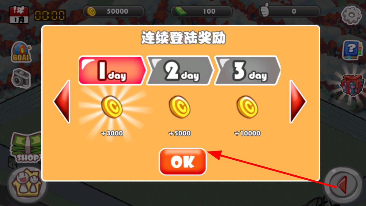 1、連續(xù)登錄游戲能獲得獎勵,登錄天數(shù)越多,獎勵的金幣數(shù)量越多,點擊OK領(lǐng)取獎勵。