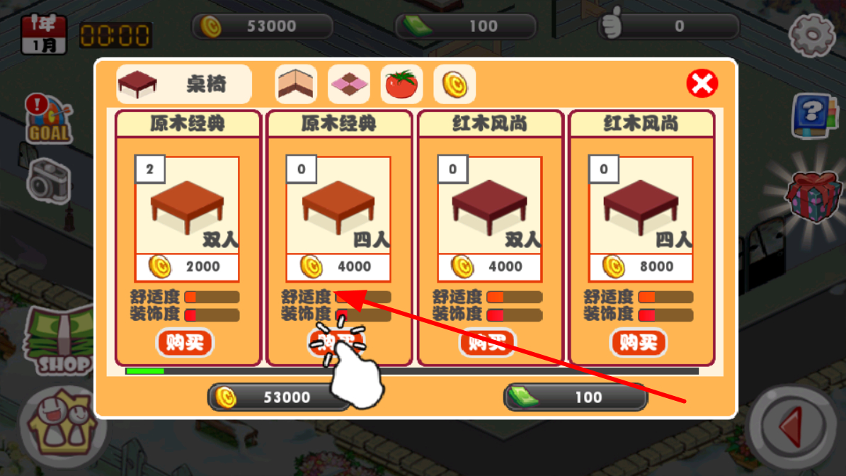 2、可花費金幣購買不同類型的桌椅,有雙人、四人等款式,不同桌椅舒適度和裝飾度不同。