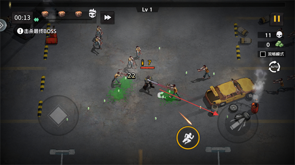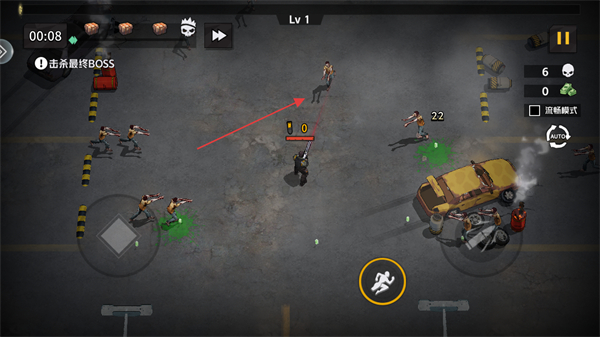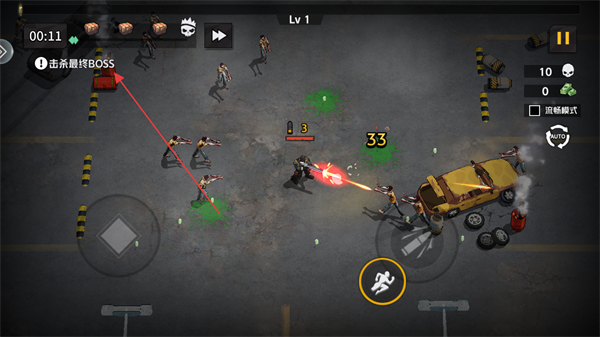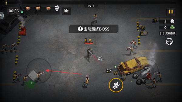 1、進(jìn)入游戲看到等級為Lv1,明確關(guān)卡目標(biāo)是擊殺最終BOSS,通過虛擬搖桿移動(dòng)角色。