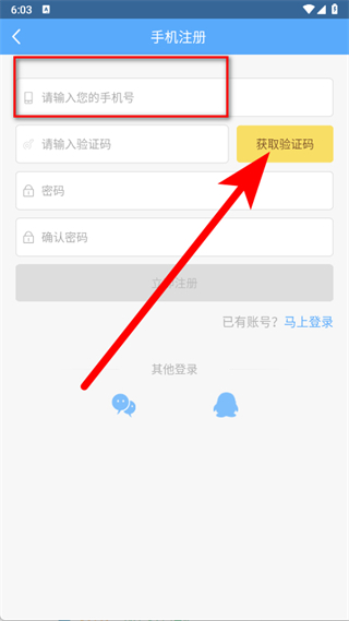 3、在手機(jī)注冊(cè)頁(yè)面,輸入手機(jī)號(hào)碼,點(diǎn)擊獲取驗(yàn)證碼。