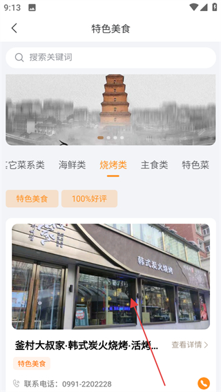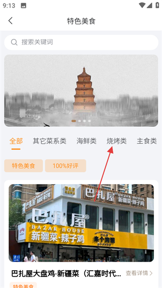 2、在特色美食頁面,點(diǎn)擊燒烤類標(biāo)簽,可查看燒烤類美食店鋪推薦。
