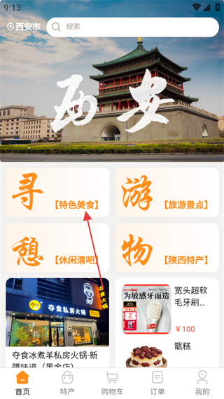 1、進(jìn)入春安美食首頁,點(diǎn)擊尋特色美食,進(jìn)入特色美食推薦頁面。