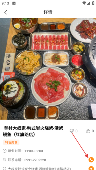 4、進(jìn)入美食詳情頁面,可查看店鋪的信息,還能點(diǎn)擊電話圖標(biāo)聯(lián)系商家。