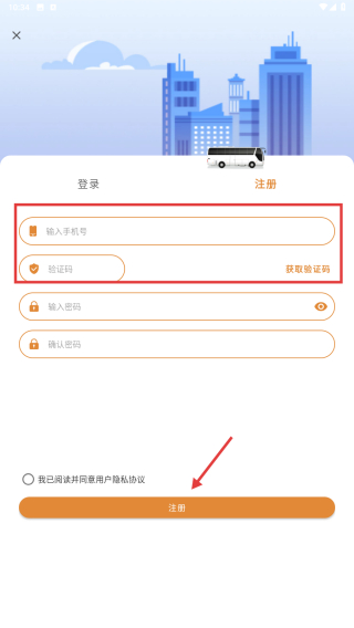 4、在注冊(cè)頁面,輸入手機(jī)號(hào),點(diǎn)擊“獲取驗(yàn)證碼”,輸入驗(yàn)證碼,設(shè)置并確認(rèn)密碼,點(diǎn)擊注冊(cè)按鈕,完成賬號(hào)注冊(cè)操作。
