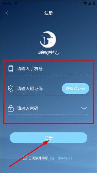 3、輸入手機號、驗證碼、密碼,點擊注冊,完成賬號注冊。