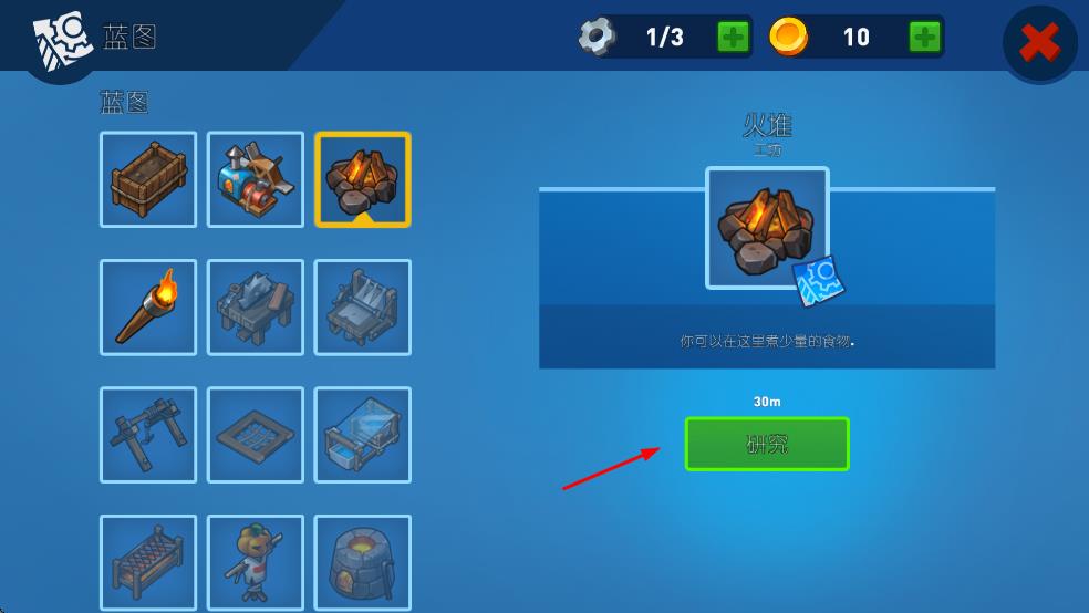 2、在藍圖中研究設施,消耗資源解鎖制作配方,提升生存能力。