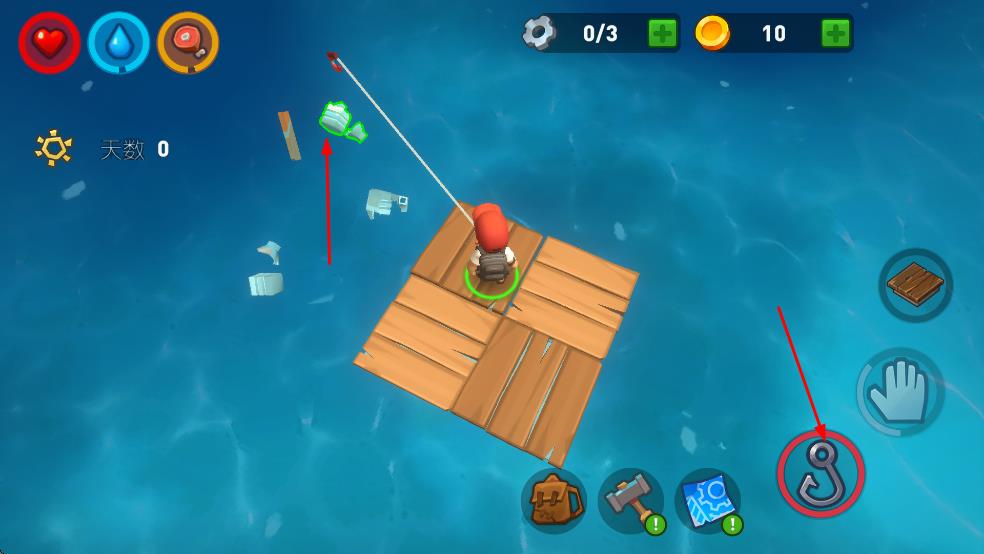 4、使用鉤子收集海上資源,用于建造和制作,持續(xù)發(fā)展木筏,保障在海上的長期生存。