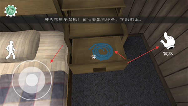4、現(xiàn)在需要使用地圖中道具逃離這里拖動左下角移動到床頭查看柜子,然后按交互按鈕獲取道具。