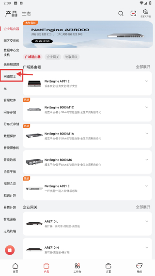 2、在產(chǎn)品頁面,點擊網(wǎng)絡(luò)安全選項,進(jìn)入網(wǎng)絡(luò)安全產(chǎn)品列表。