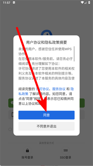1、打開金山協(xié)作,在彈出的窗口中,點(diǎn)擊藍(lán)色的同意按鈕。
