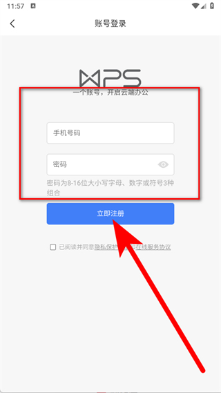 4、輸入手機(jī)號(hào)碼和密碼,勾選后,點(diǎn)擊藍(lán)色的立即注冊(cè)按鈕,完成賬號(hào)注冊(cè)。