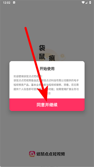 1、打開袋鼠點點短視頻,在彈出的提示窗口中,點擊粉色的同意并繼續(xù)按鈕。