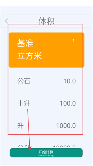 3、在體積單位轉(zhuǎn)換頁面,選擇基準(zhǔn)單位后,點(diǎn)擊開始計(jì)算,可進(jìn)行體積單位轉(zhuǎn)換計(jì)算。
