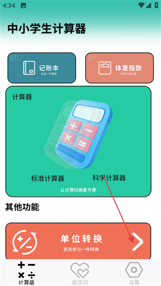 1、進(jìn)入中小學(xué)生計(jì)算器首頁,點(diǎn)擊單位轉(zhuǎn)換,進(jìn)入單位轉(zhuǎn)換功能頁面。