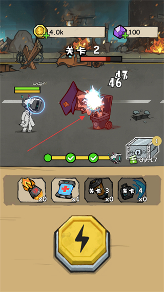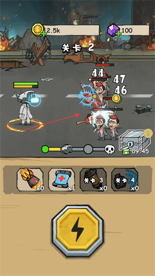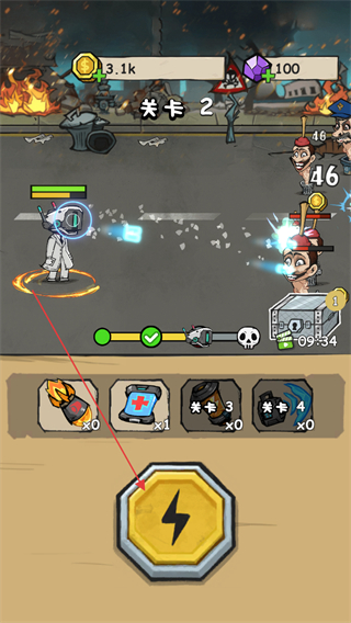 2、點擊下方閃電按鈕釋放技能,快速打擊敵人,推進關(guān)卡進度。