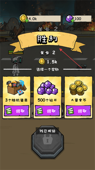4、通關(guān)關(guān)卡2后,可選擇獎勵,獲取道具、鉆石或金幣,助力后續(xù)戰(zhàn)斗。