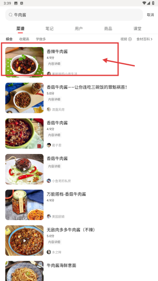 3、在牛肉醬內(nèi)容列表中,選擇香辣牛肉醬筆記,點擊進入詳情頁面。