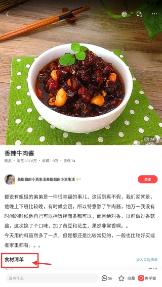 4、在筆記詳情頁面,查看食材清單,可獲取制作香辣牛肉醬所需的食材信息,以便進行烹飪準備。