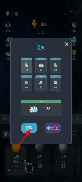 3、在簽到界面,點擊獲取按鈕,可領取每日簽到獎勵,獎勵包含不同數量的資源,助力建設。