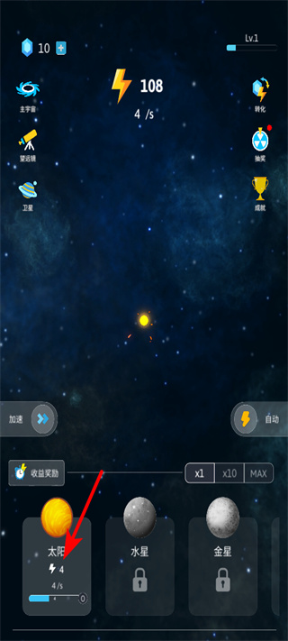 2、點擊宇宙區(qū)域,可產生能量,能量是推動宇宙建設和星球發(fā)展的重要資源,需要持續(xù)獲取。